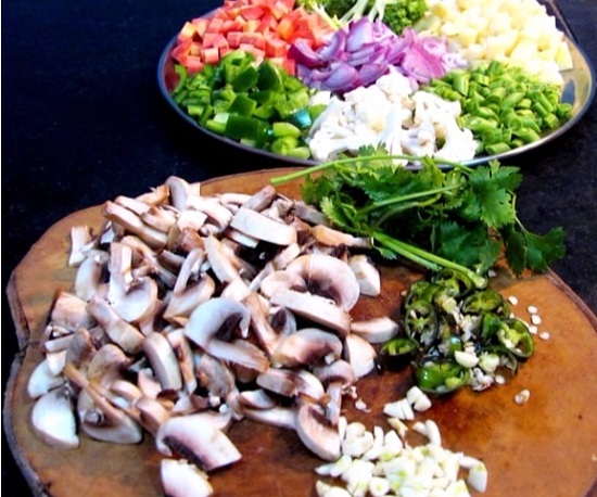 - Овощи, картофельные клубни и грибочки чистим, промываем и шинкуем кубиками.