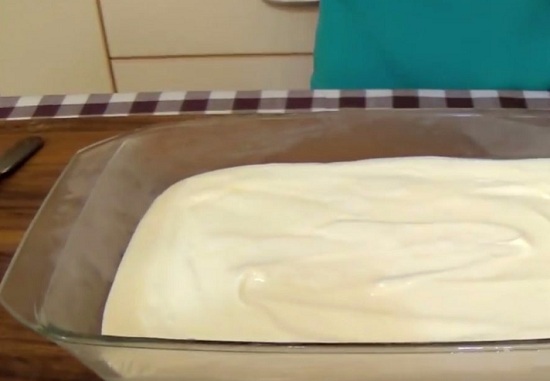 - Переливаем полученную массу в форму, накрываем пищевой пленкой и отправляем в морозильную камеру на часик.